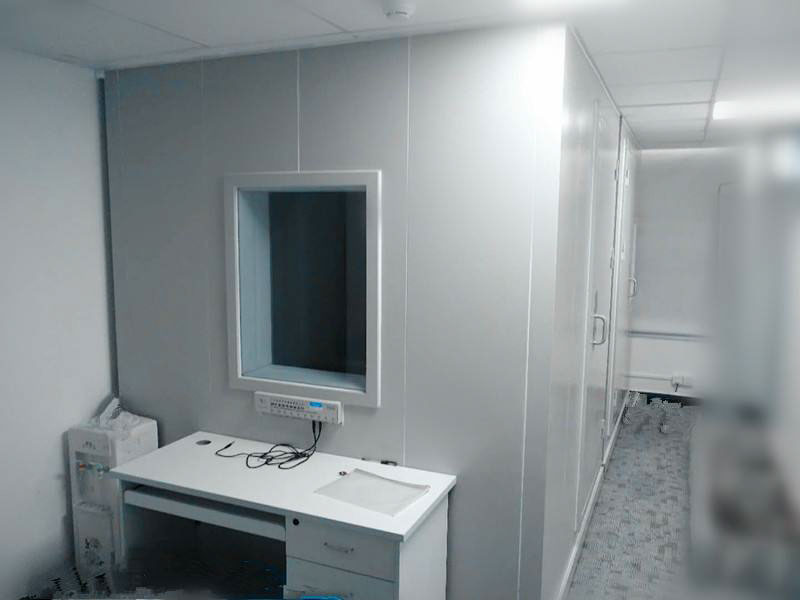 隔声门:齐平安装凸轮提升合页,磁性密封,隔声门板的内外棉使用冷轧钢板制造,门侧、门顶与门框装有两套词性压缩密封带,当门处于关闭位置时形成隔声环。门板底部是在门关闭时能使门紧压地板的重力作用密封条,不采用门槛式密封。隔音窗为具有压力密封的铝型材窗框结构,使用双层夹胶安全玻璃窗。接线系统、照明系统、通风系统都会按照客户要求而配置。