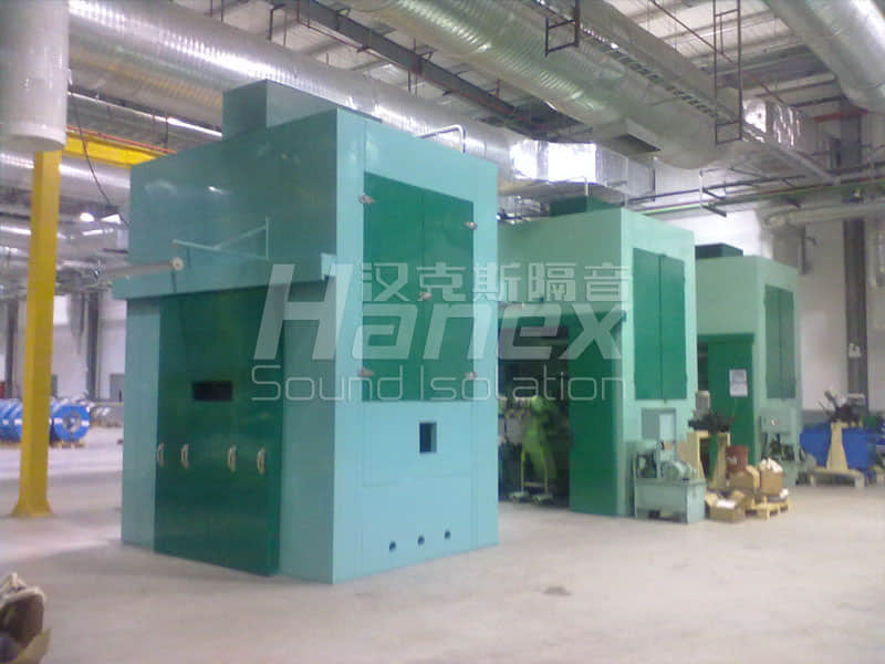 案例简介:厂区车间内有三台冲床,用于生产汽车零配件,单台冲床运作时噪声值在96dB(A),影响较大。汉克斯隔音对三台冲床分别增设了隔声罩后,在隔声罩1米处量的噪声值为76dB(A)(单台)。隔声罩内设有通风散热等性能,不影响设备本身使用。