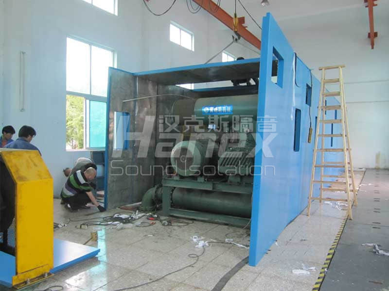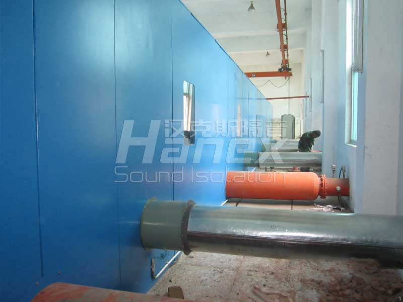 案例简介:厂内有5台罗茨鼓风机,单台风机功率为132Kw,5000m3/hr,运行时噪声值在105dB(A)以上。治理后,在隔声罩1米处噪声值小于85dB(A),达到规定值。
