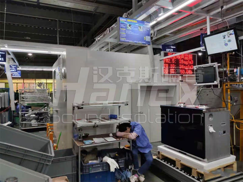 外部噪声值≤80dB(A)时,安装汉克斯隔音设计的静音房后,按测试标准,房内部距异音测试房墙壁1米,离地高度1.2米处,噪声值控制在50dB(A)以内(排除其他噪声影响)。