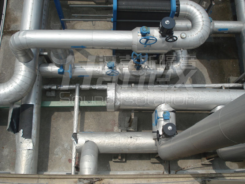 各机组水泵的水管穿过墙体时,使得管路直接向墙体传递振动噪声。本方案将在这些穿墙管路上加装隔振,套管与穿墙管之间的间隙里填满减震隔音材料(带一定阻尼),在隔振的同时确保密封,避免因泄露导致水泵房中的噪声传播到隔壁房间里。
