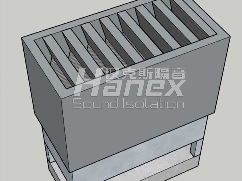 (3)消声器外壁厚度选用80mm-100mm厚吸隔声模块板,模块板结构为:1.2mm以上冷轧镀锌钢板+阻尼+容重48kg/m³以上多纤维玻璃棉+玻璃丝布包裹+厚度0.8mm以上冷轧镀锌穿孔板。
